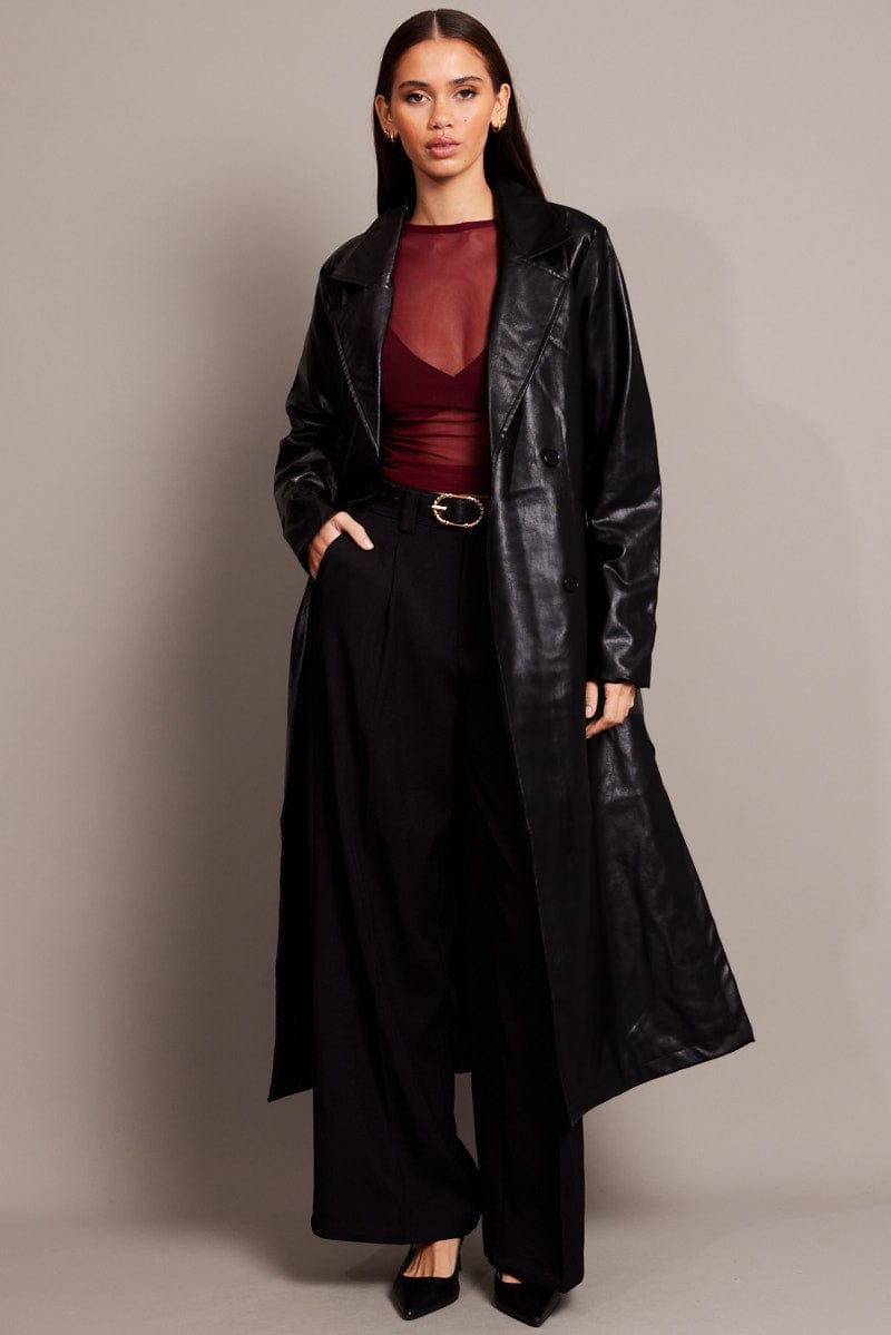 Black Trench Coat Long Sleeves Faux Leather