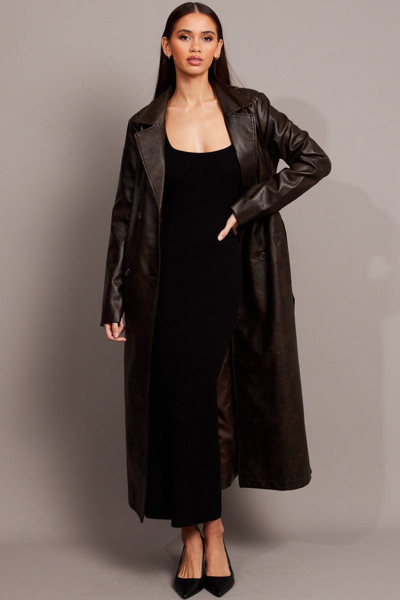 Brown Trench Coat Long Sleeves Faux Leather