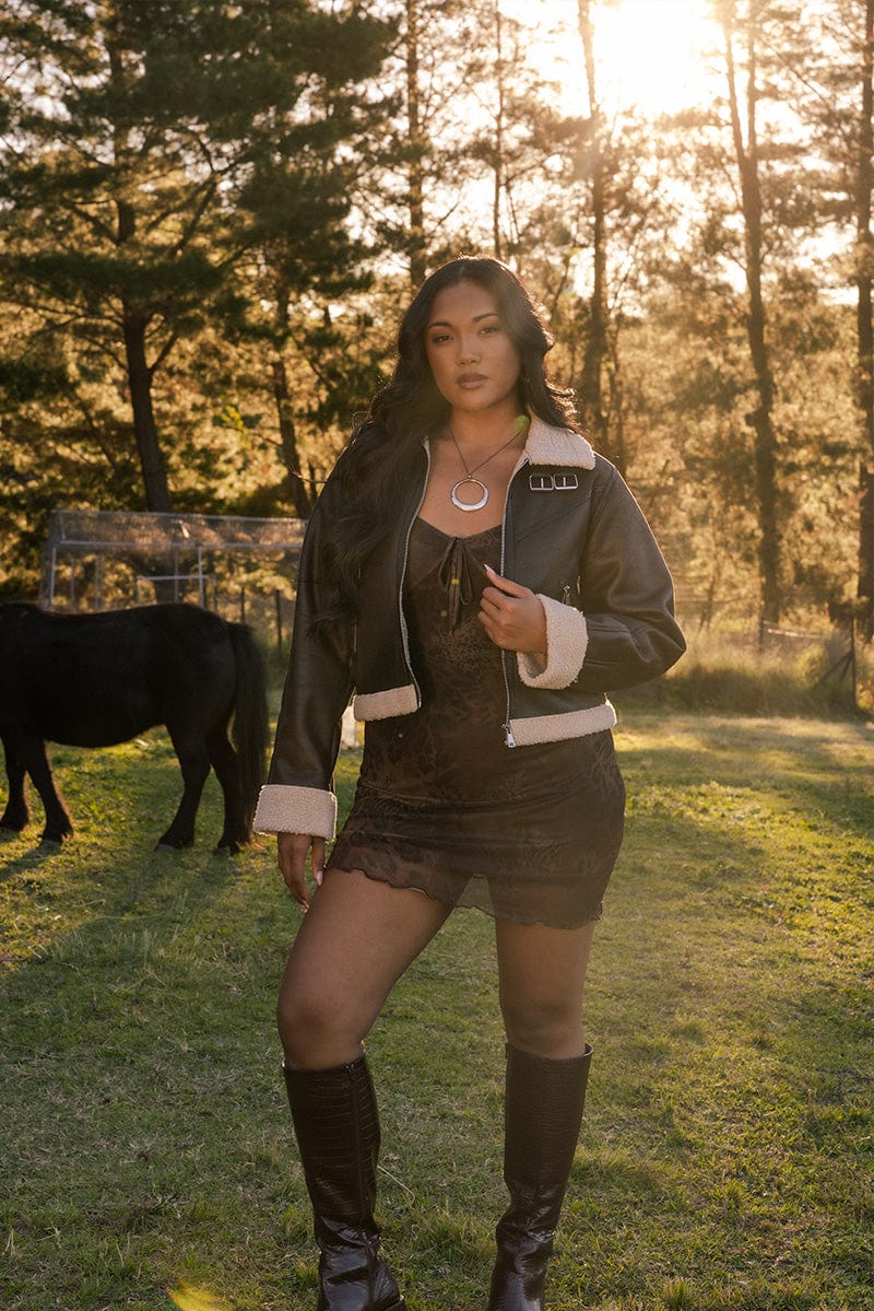 Brown Bomber Jacket Crop Washed Faux Leather