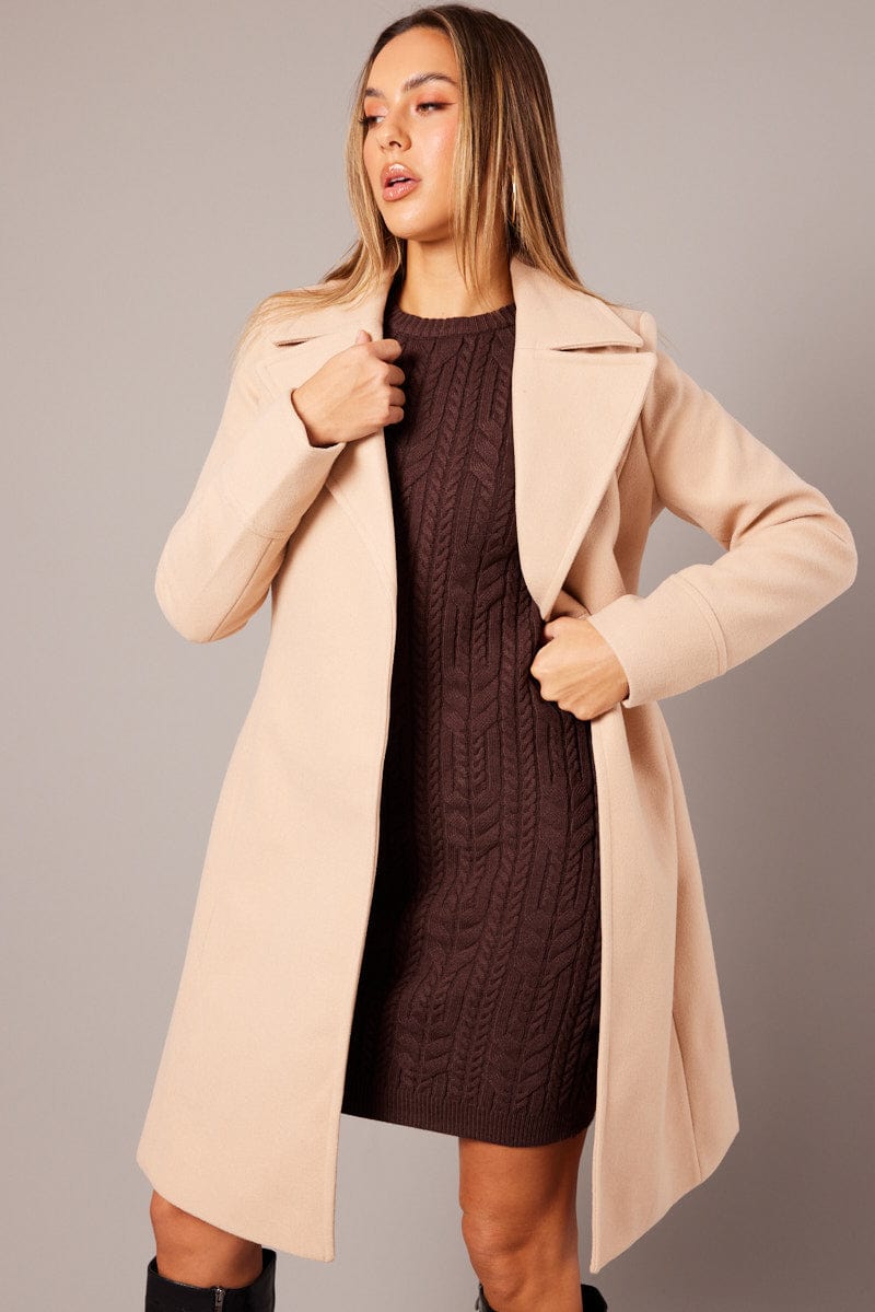 Beige Tie Front Coat Knee Length
