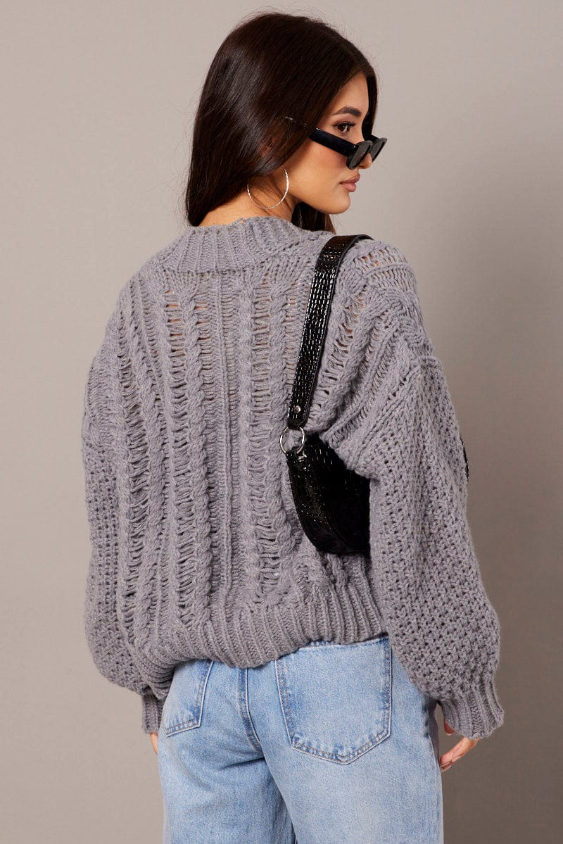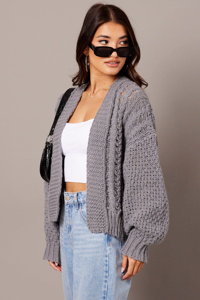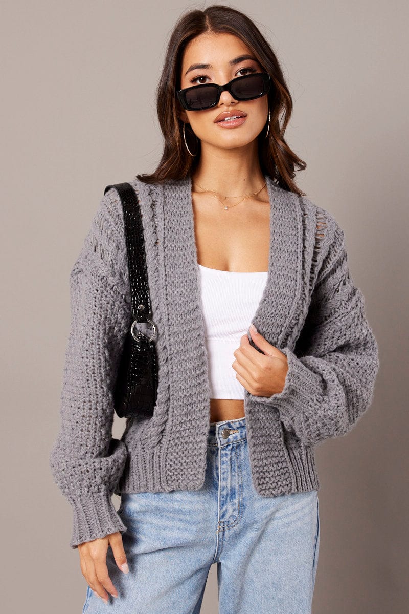Grey Knit Cardigan Long Sleeve Relaxed Fit Cable