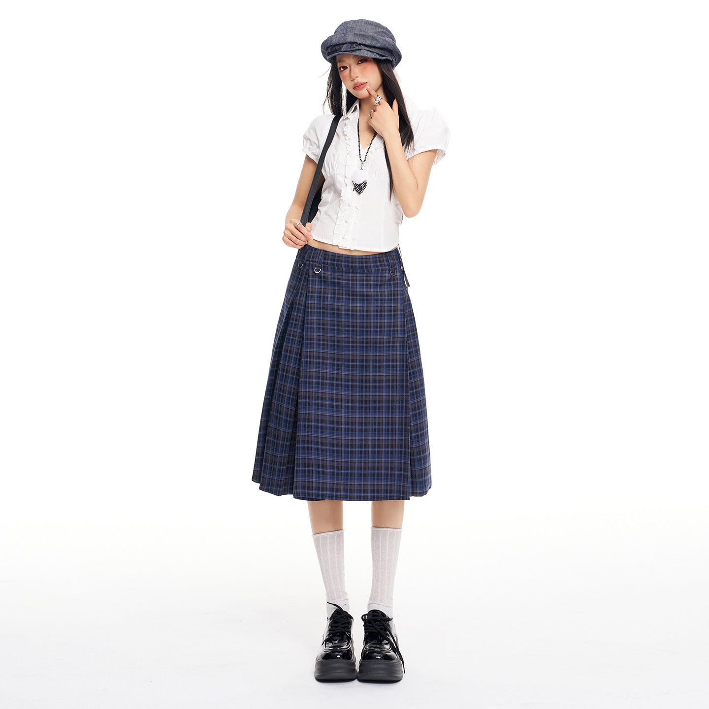 Navy Plaid A-Line Midi Skirt with Large Bow — Loose-Fitting and Slimming