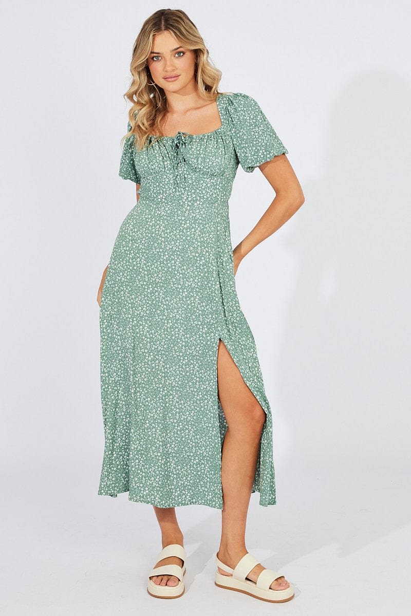 Green Floral Midi Dress Puff Sleeve Midi
