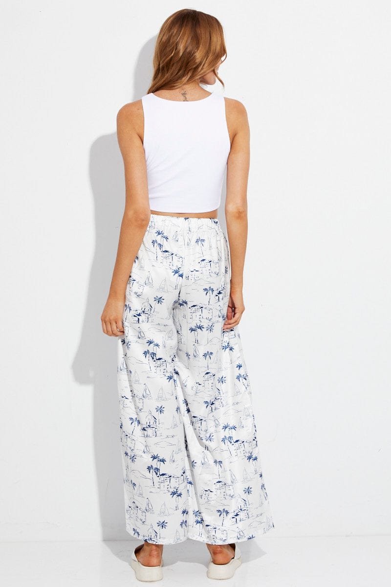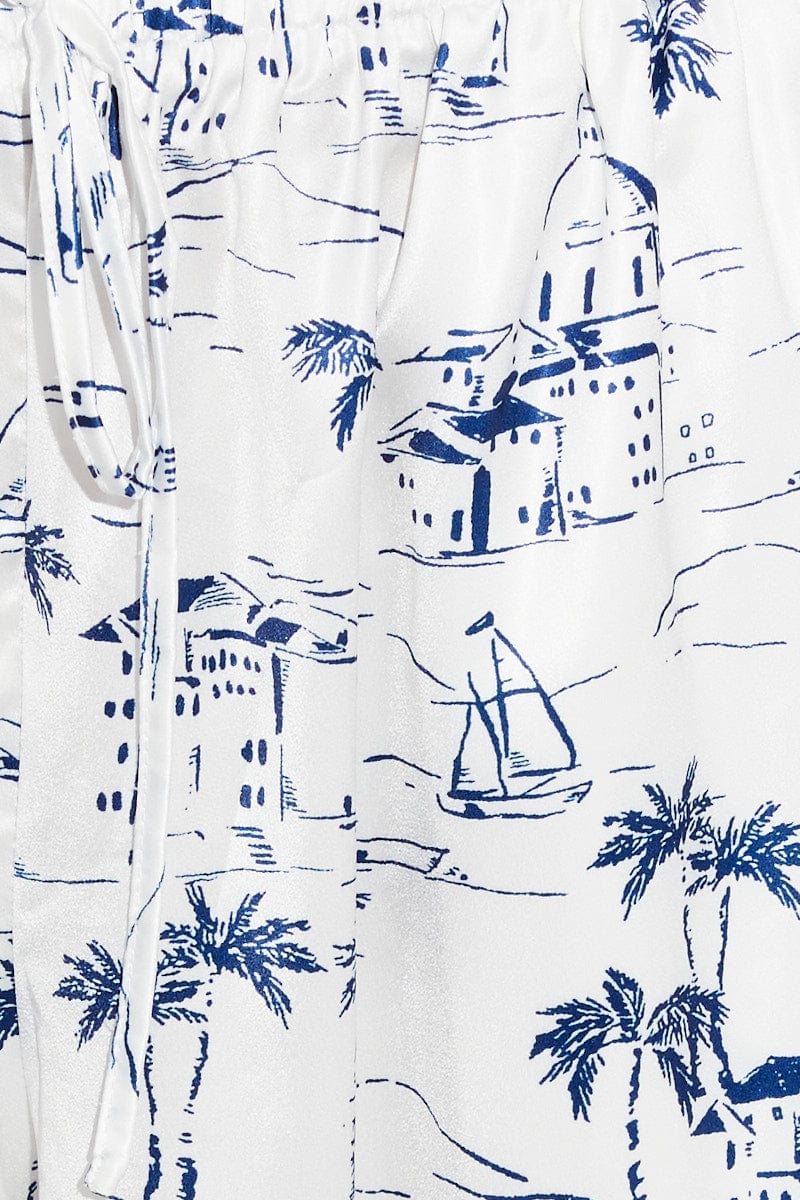 Blue Abstract Pant Elastic High Waist Wide Leg Printed Satin